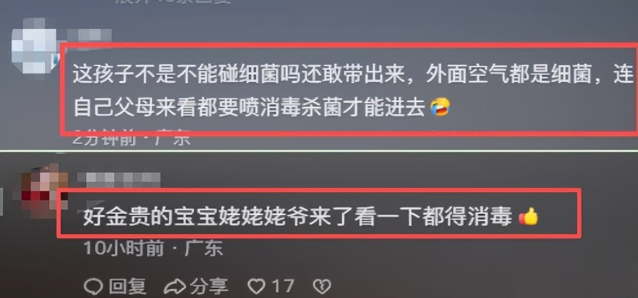 此画面引发观众犀利评论:这孩子之前不是不能碰细菌吗,现在还敢带出来,外面空气中到处都是细菌。看来让父母“消毒”这件事,网友们一直记着呢。